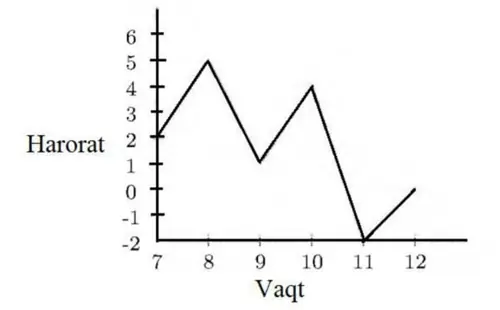 Grafikda ko'rsatilganidek, qish kunidagi harorat har soatda ertalab soat 7 dan 12 gacha selsiy bo'yicha qayd etilgan. Ertalab soat 9:00 va 11:00 da qayd etilgan haroratlar necha selsiyga farq qilmoqda?